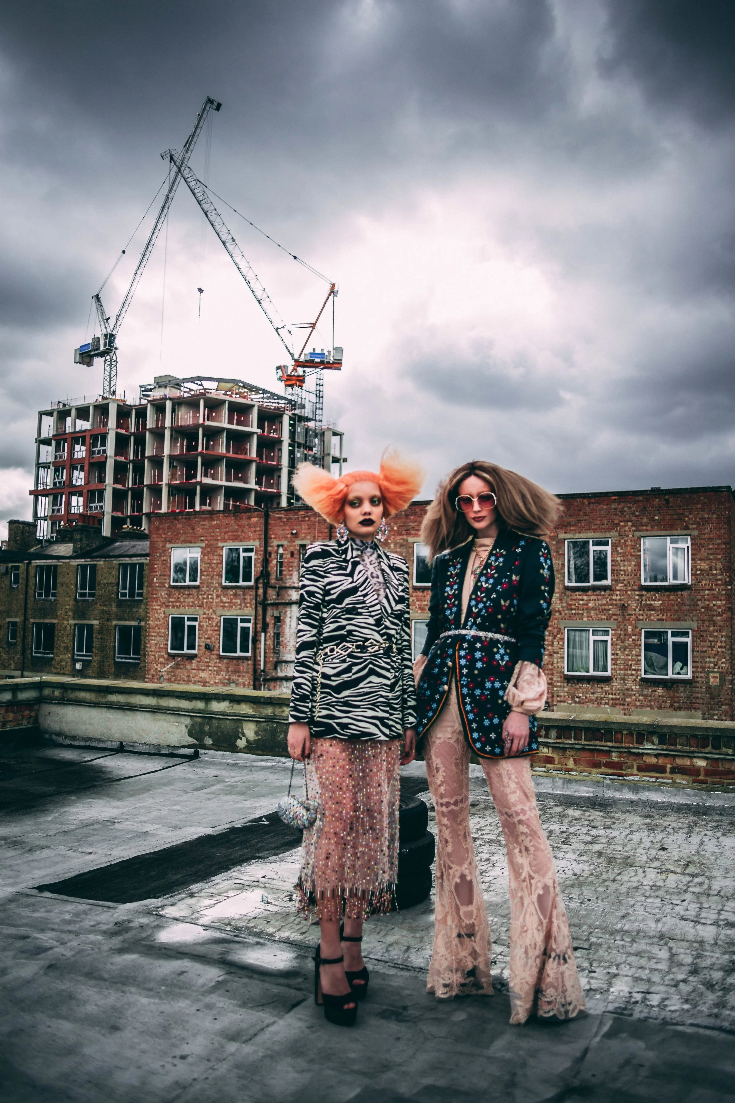 Two women with dramatic fashion styles standing on a rooftop with a construction site and cloudy sky behind them.