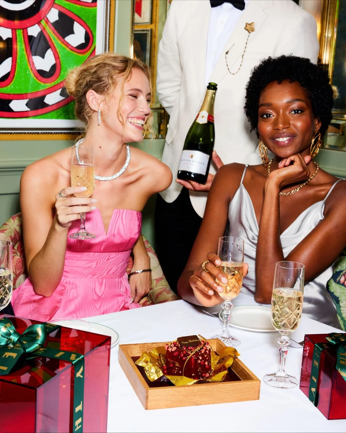 Two women celebrating at a party, dressed in elegant attire, holding glasses of champagne, with gift boxes and a decorated cake on the table.